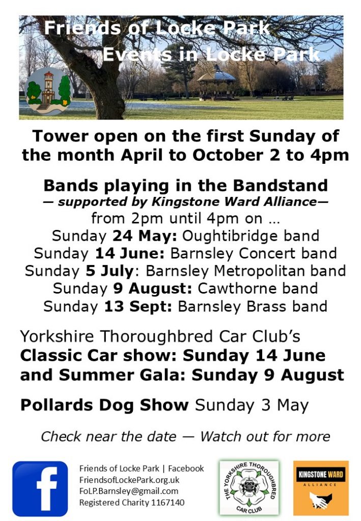 Brass band concerts in Locke Park started again in May, with one or two a month to September, sponsored by Kingstone Ward Alliance and Virgin Money. Yorkshire Thoroughbred Car Club has its Classic Car event in June and its Gala in August. And more later in the year …